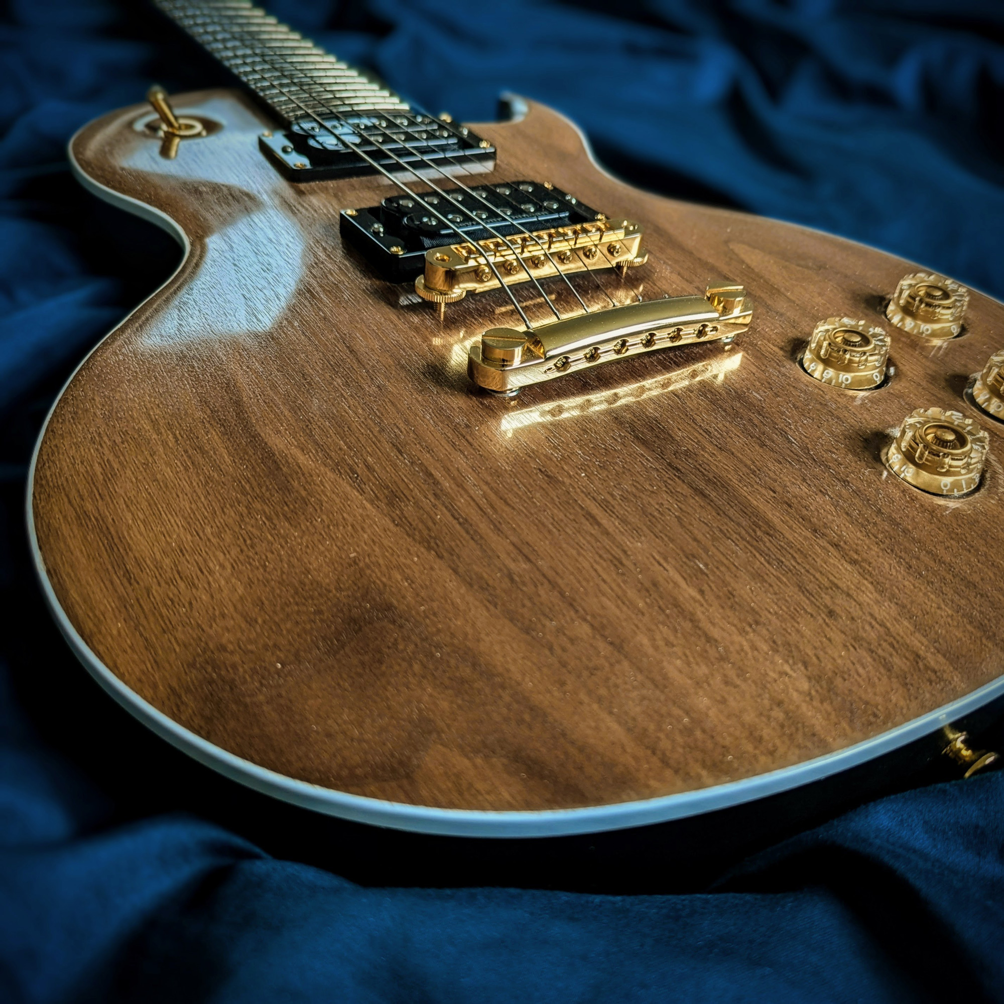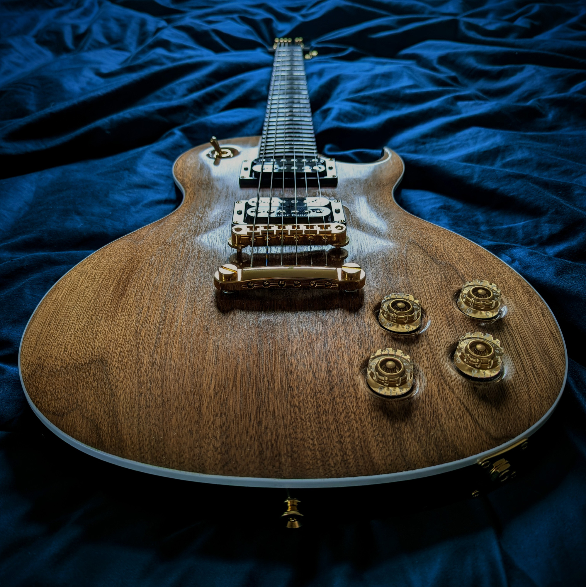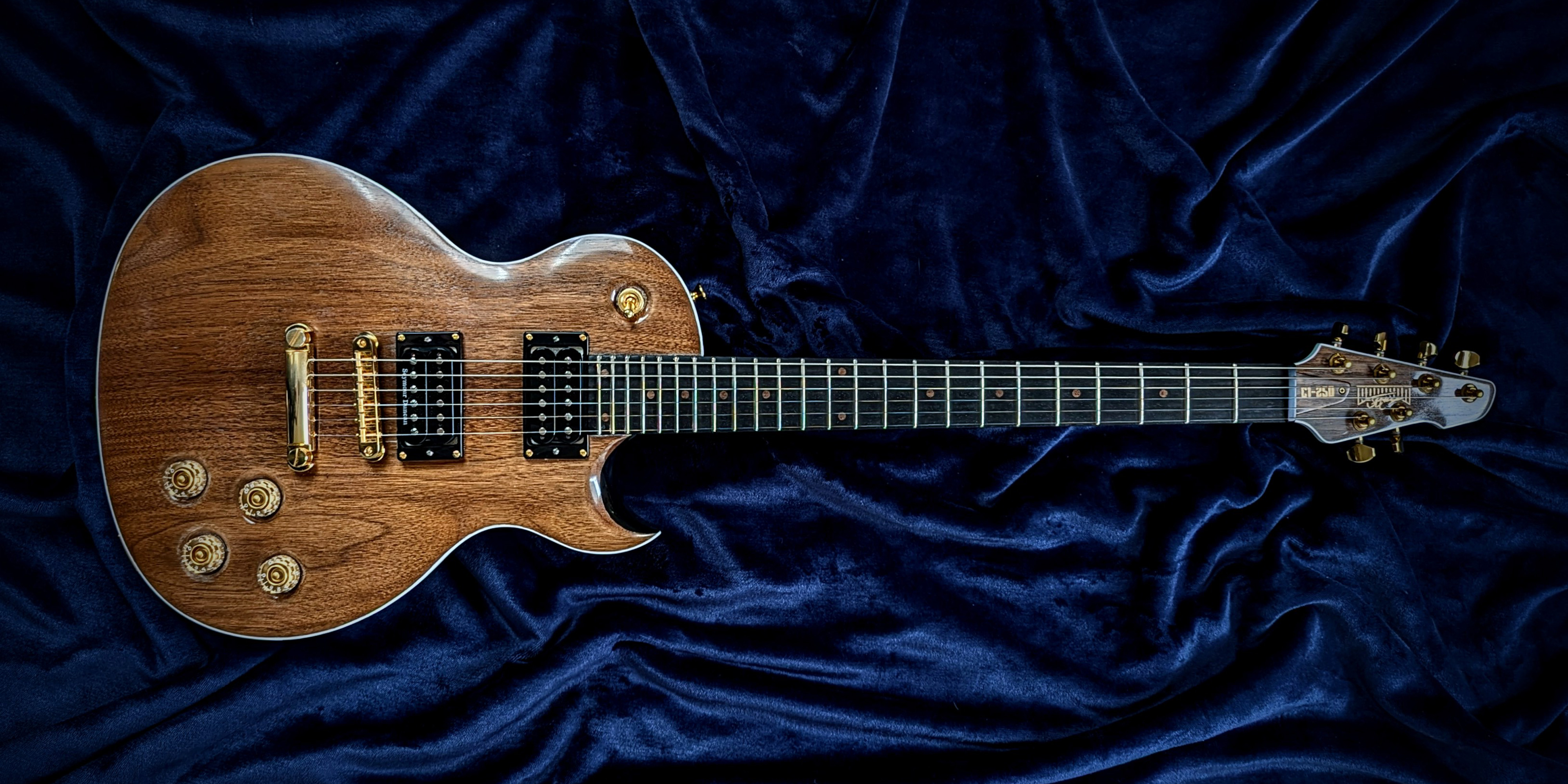 This is my first handmade guitar, creatively named the C1-250 (stands for 1 cutaway, 25.0 inch scale-length.) It's an original design that bears resemblance to a Les Paul or PRS. The body is alder with an American black walnut top and white binding, the neck is maple with black walnut headstock veneer, and the fretboard is made of ebony.
