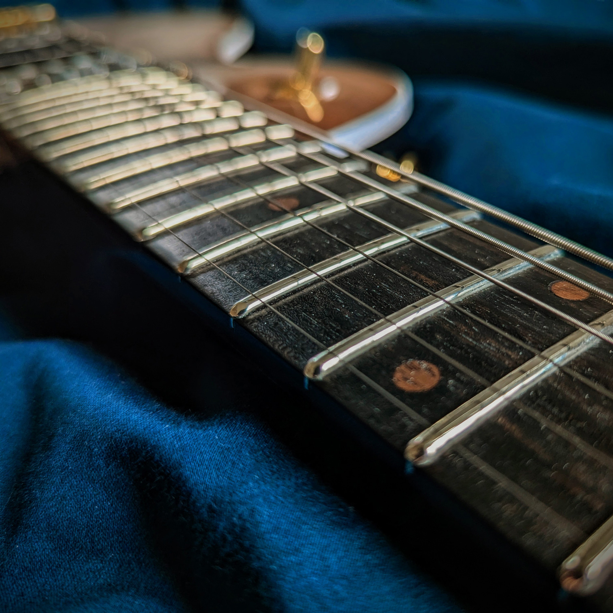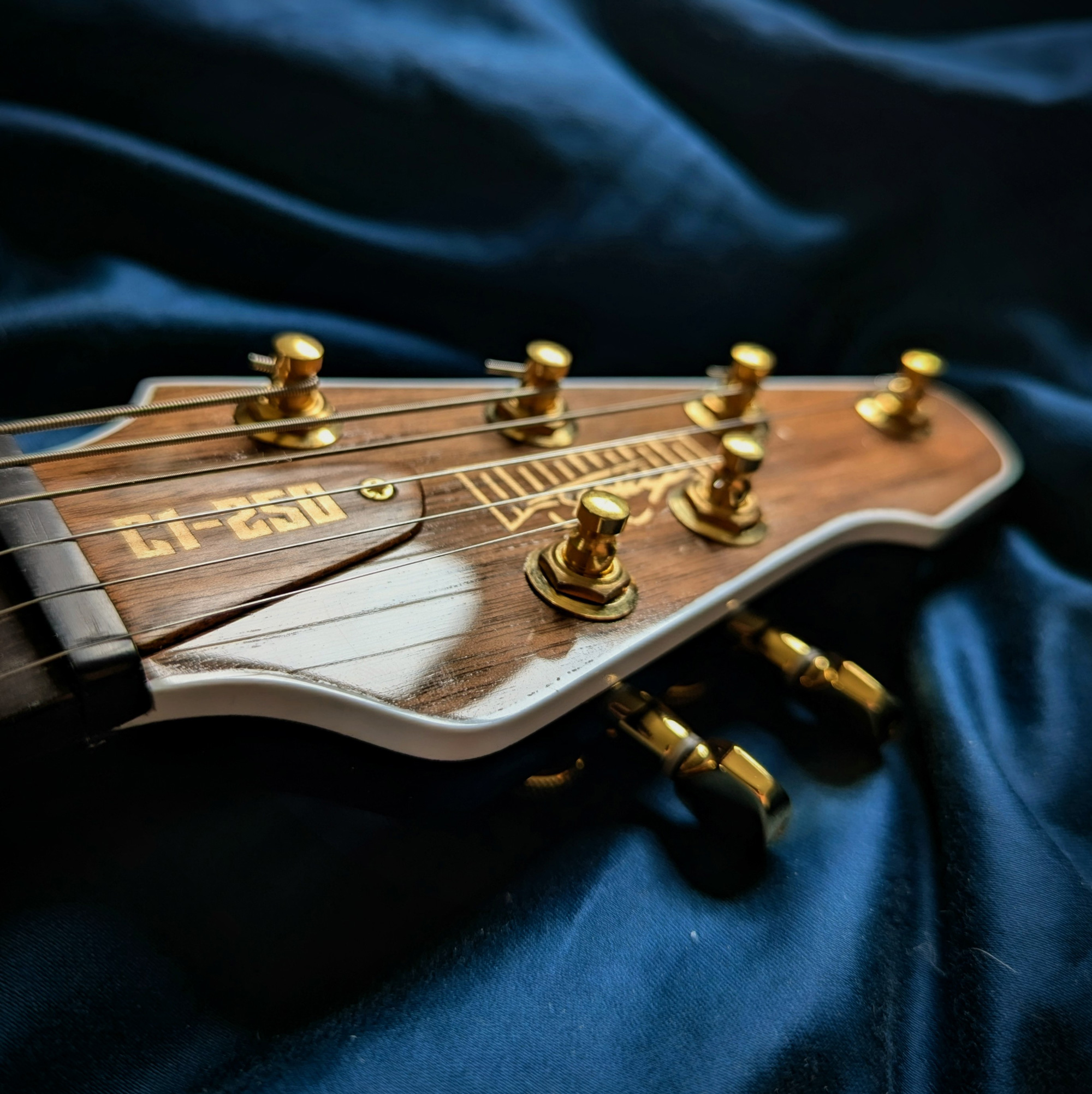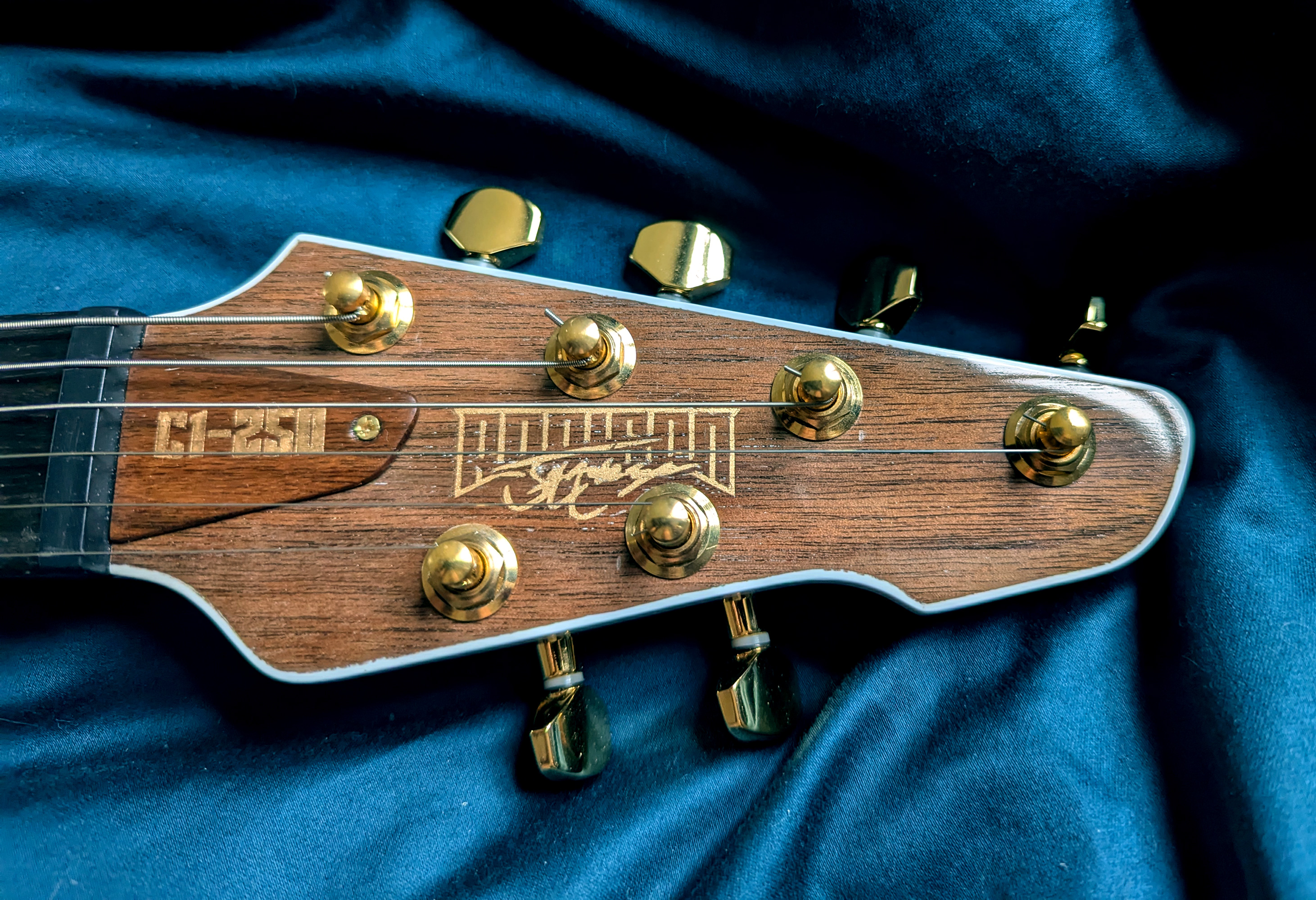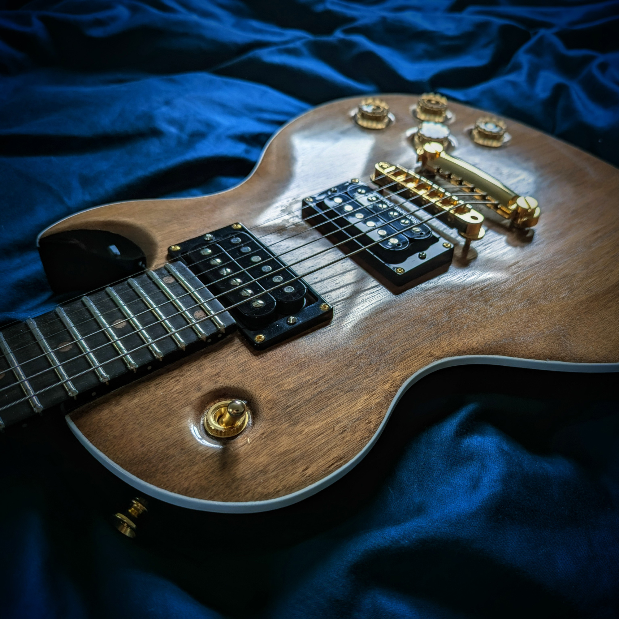 This is my first handmade guitar, creatively named the C1-250 (stands for 1 cutaway, 25.0 inch scale-length.) It's an original design that bears resemblance to a Les Paul or PRS. The body is alder with an American black walnut top and white binding, the neck is maple with black walnut headstock veneer, and the fretboard is made of ebony.