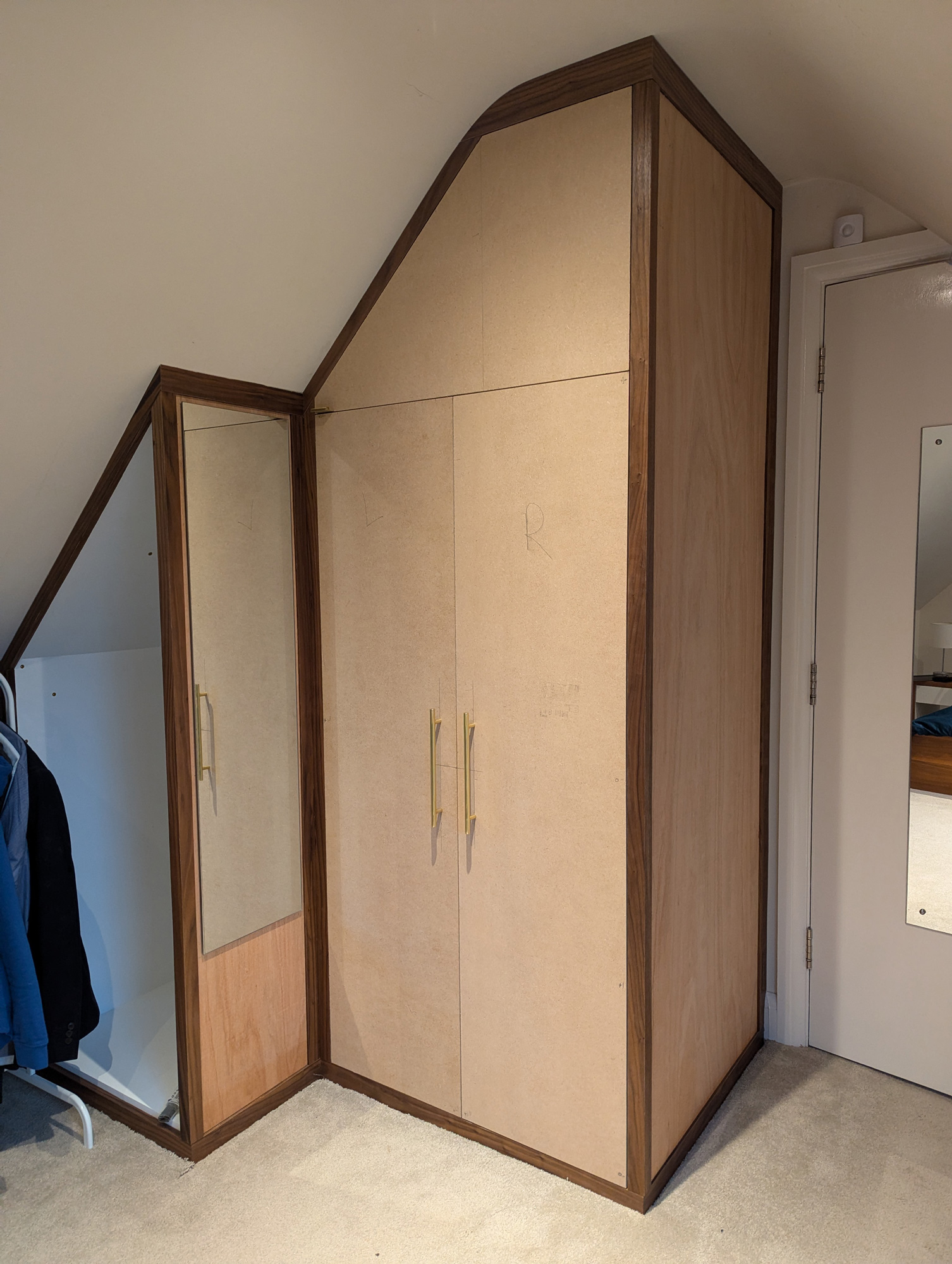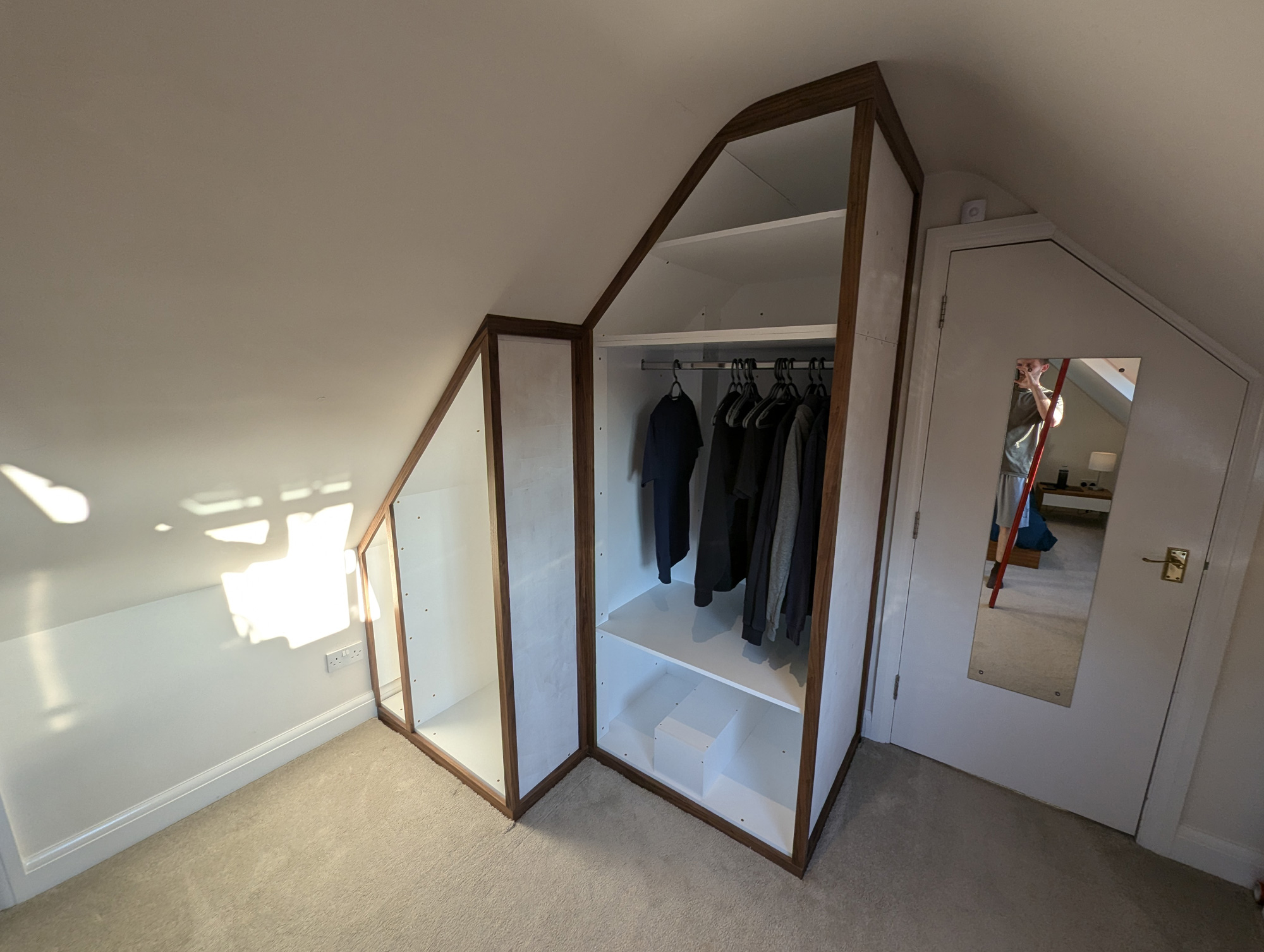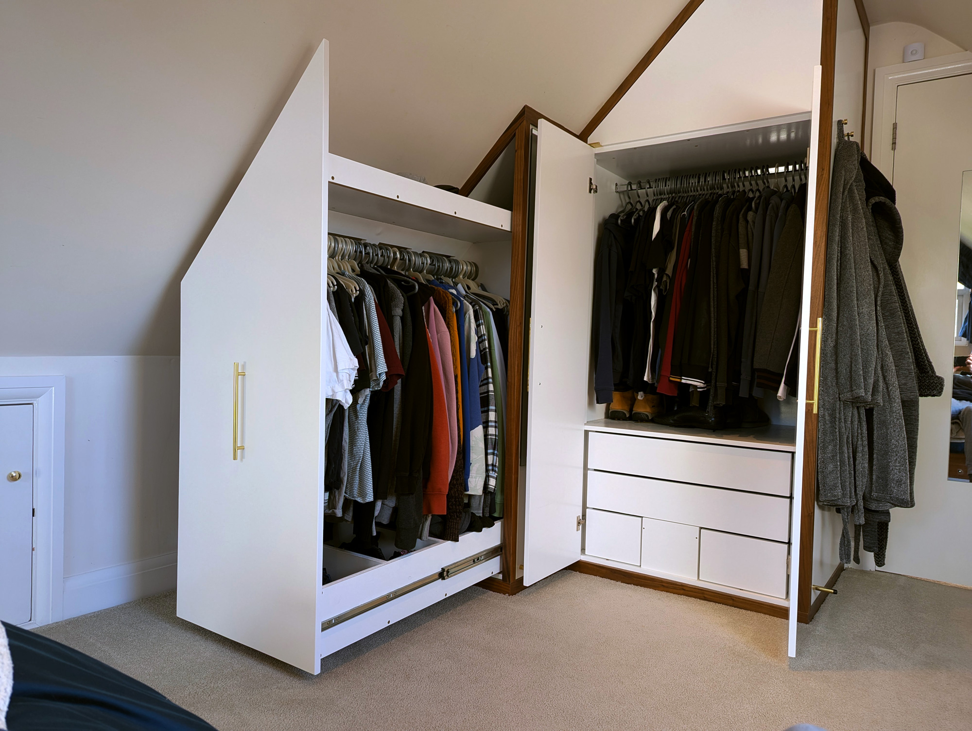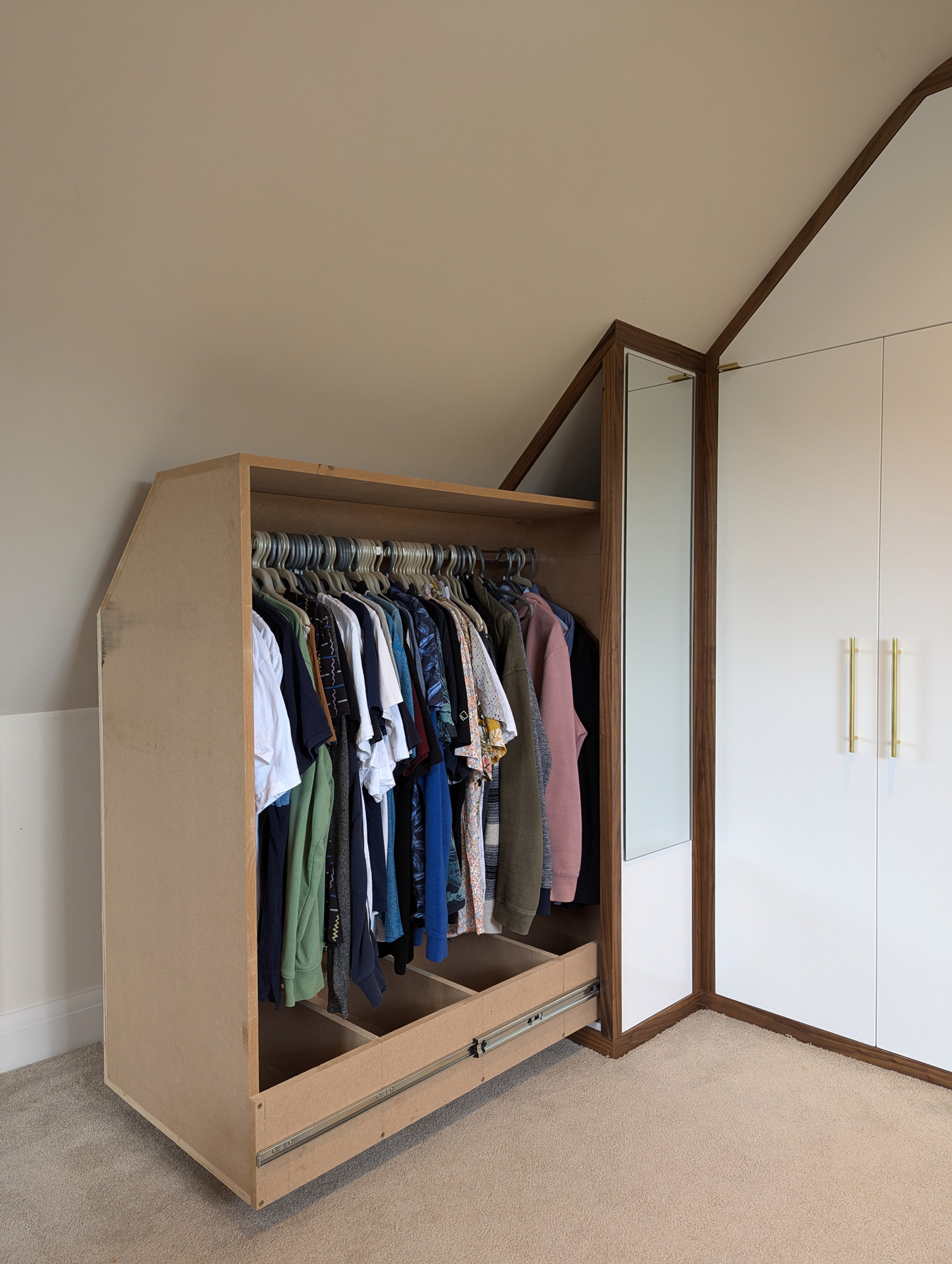 I designed & built this compact double wardrobe for my bedroom in my chalet bungalow's loft conversion. It has two wardrobe compartments (one slide-out and one standard) and features a number of drawers and storage surfaces for extra items. The drawers at the bottom are specially configured to allow maximum space usage around the soil stack that extends from the adjacent bathroom. The box at the bottom-middle of the drawers also features an access hatch, should the soil pipe need to be reached in case of repairs etc.