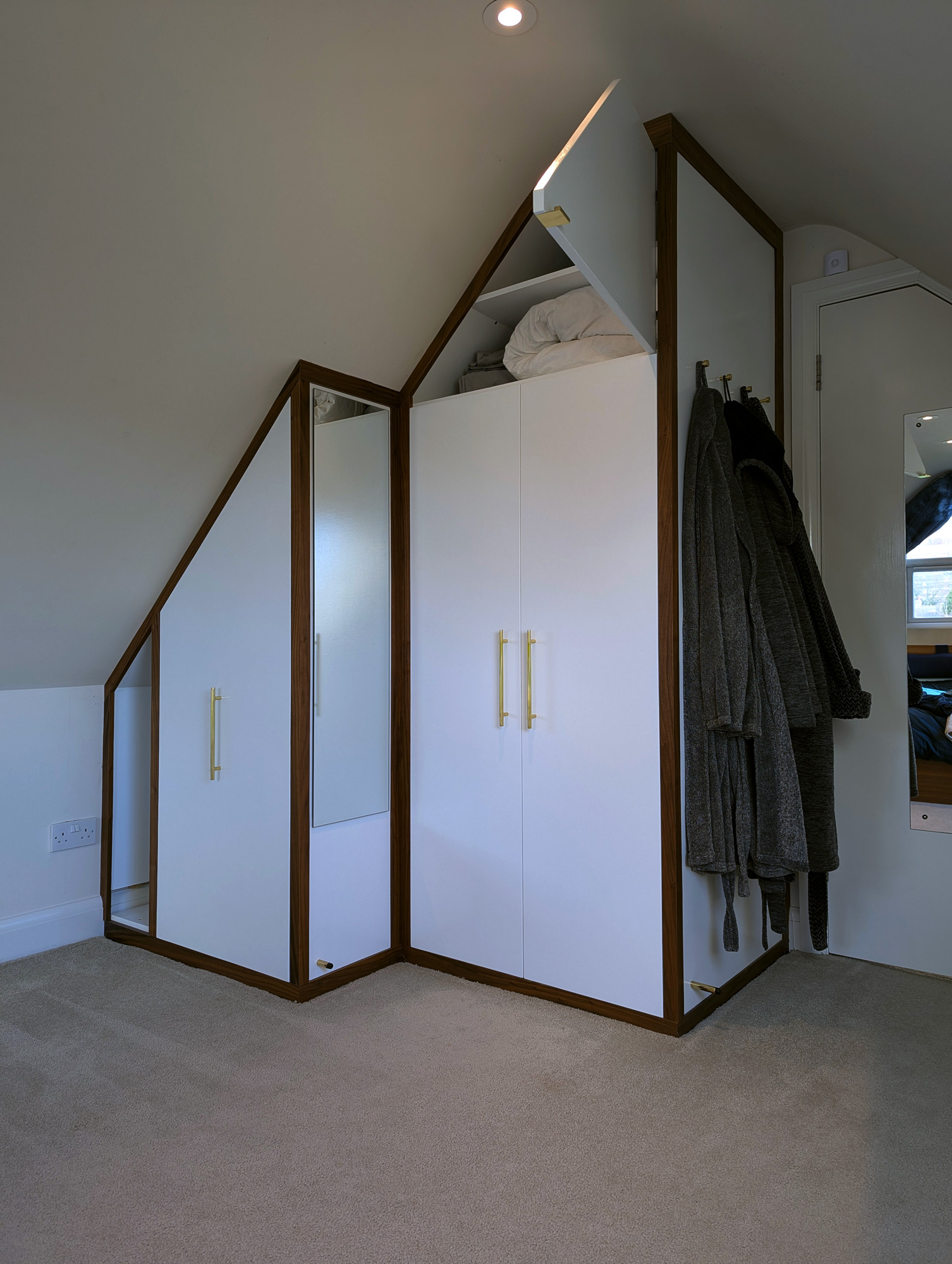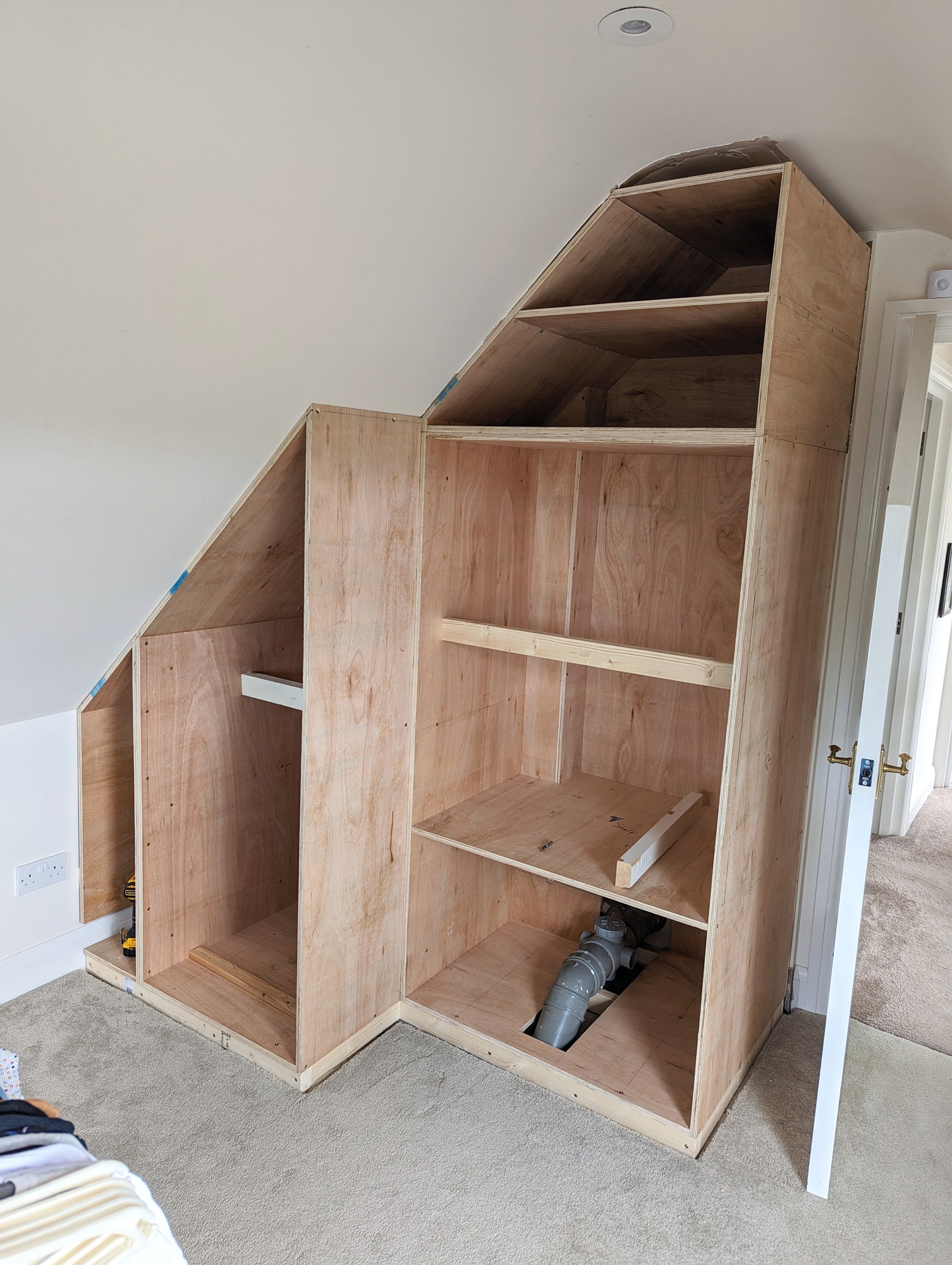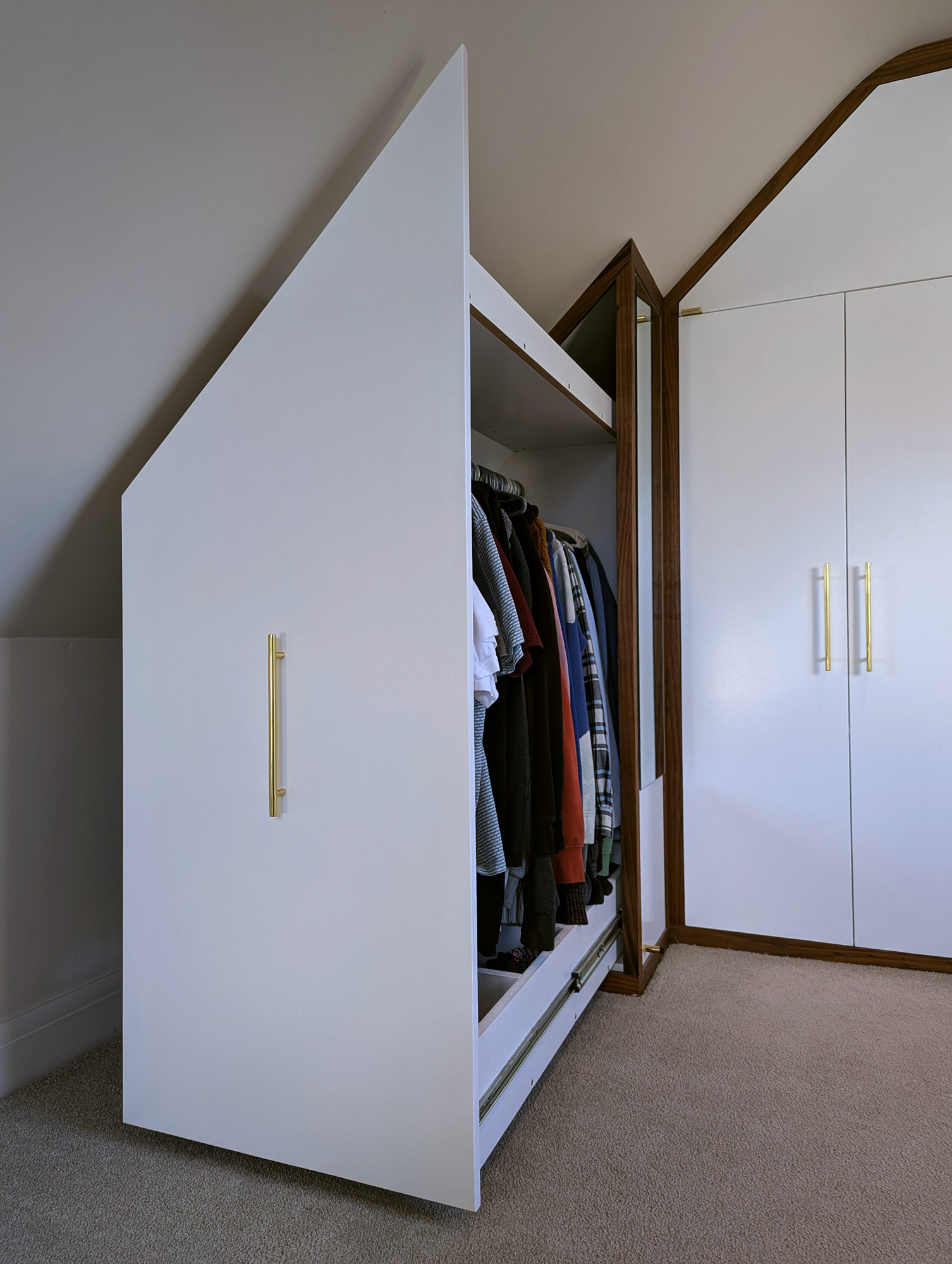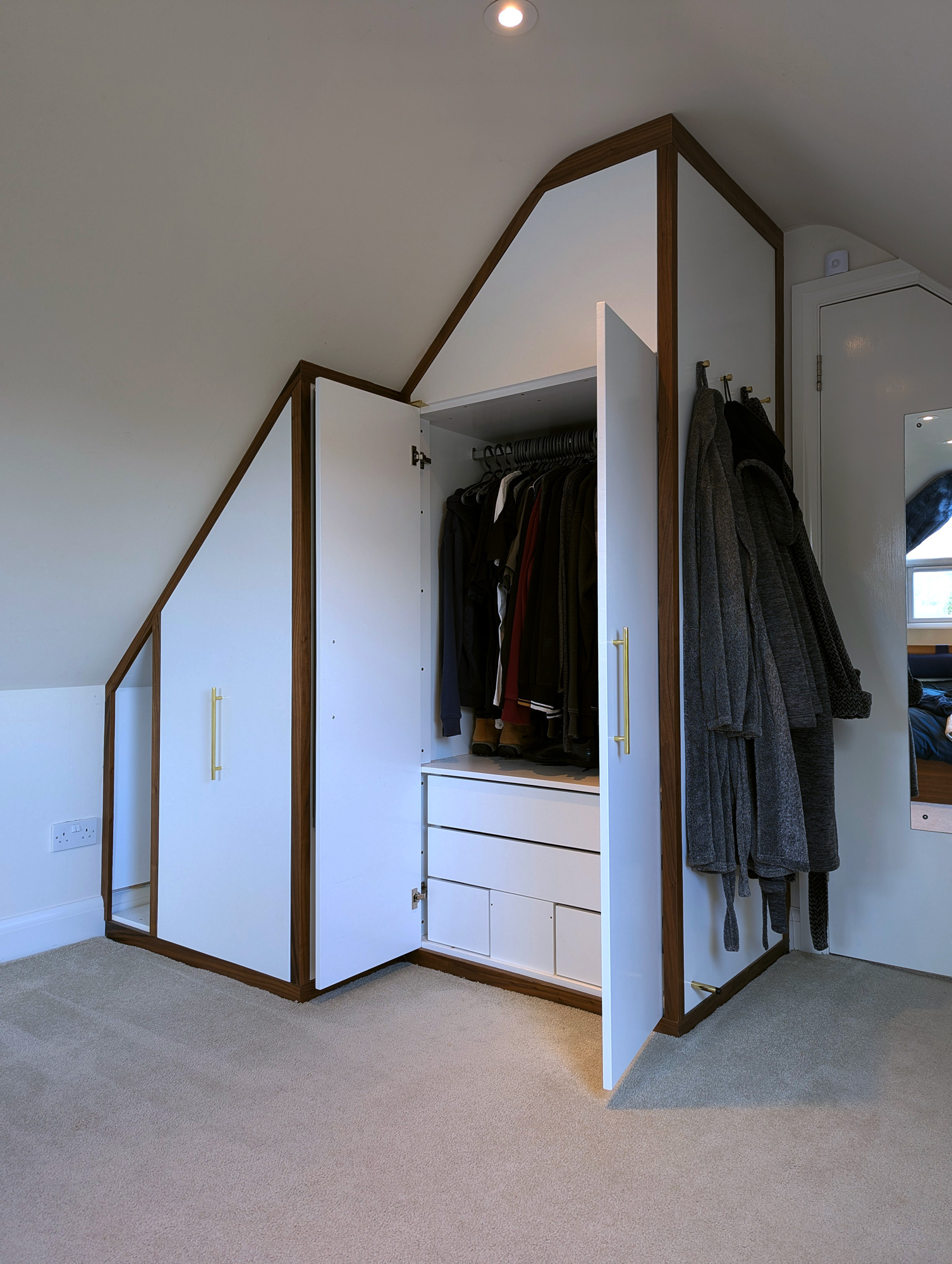 I designed & built this compact double wardrobe for my bedroom in my chalet bungalow's loft conversion. It has two wardrobe compartments (one slide-out and one standard) and features a number of drawers and storage surfaces for extra items. The drawers at the bottom are specially configured to allow maximum space usage around the soil stack that extends from the adjacent bathroom. The box at the bottom-middle of the drawers also features an access hatch, should the soil pipe need to be reached in case of repairs etc.