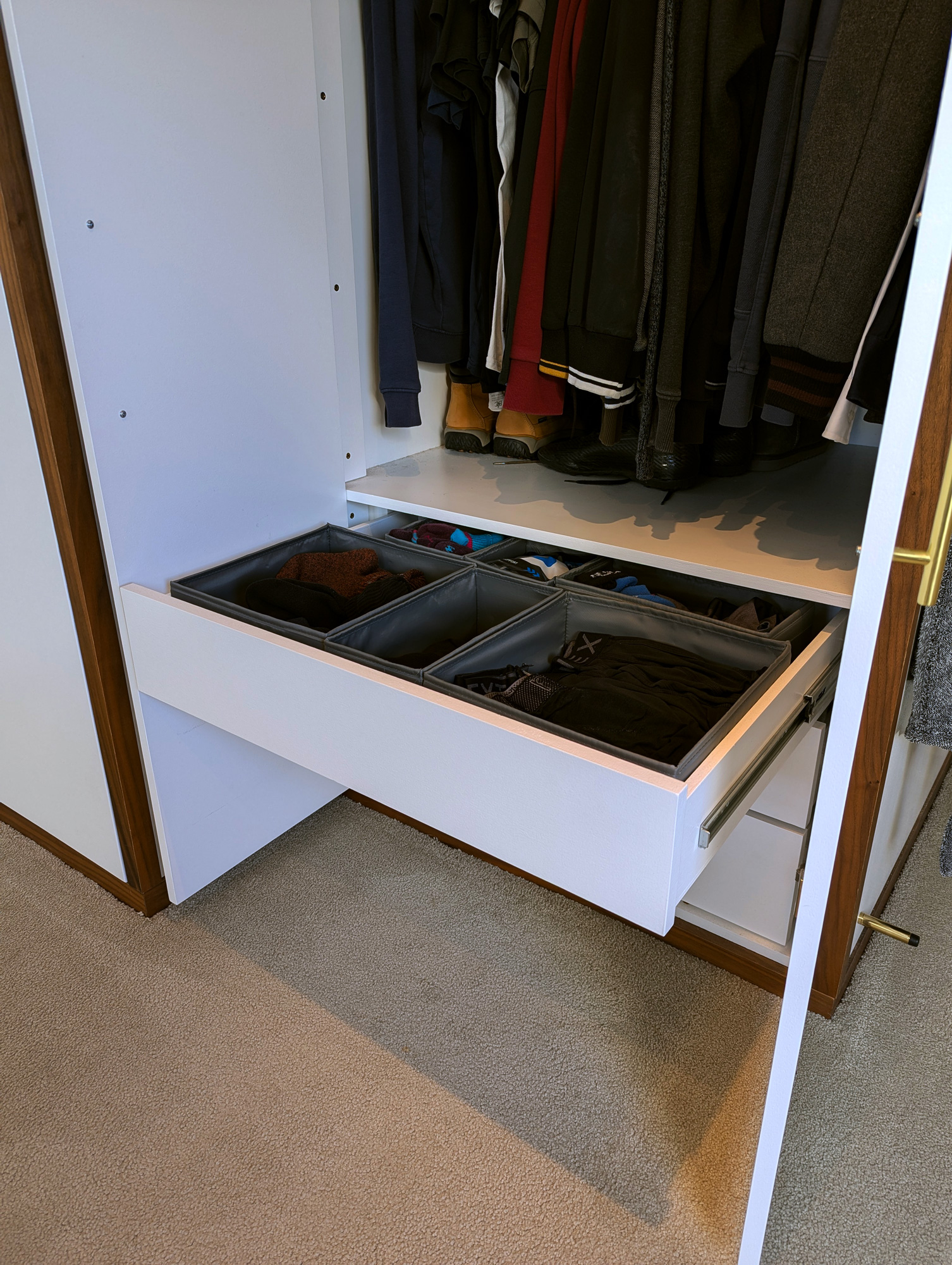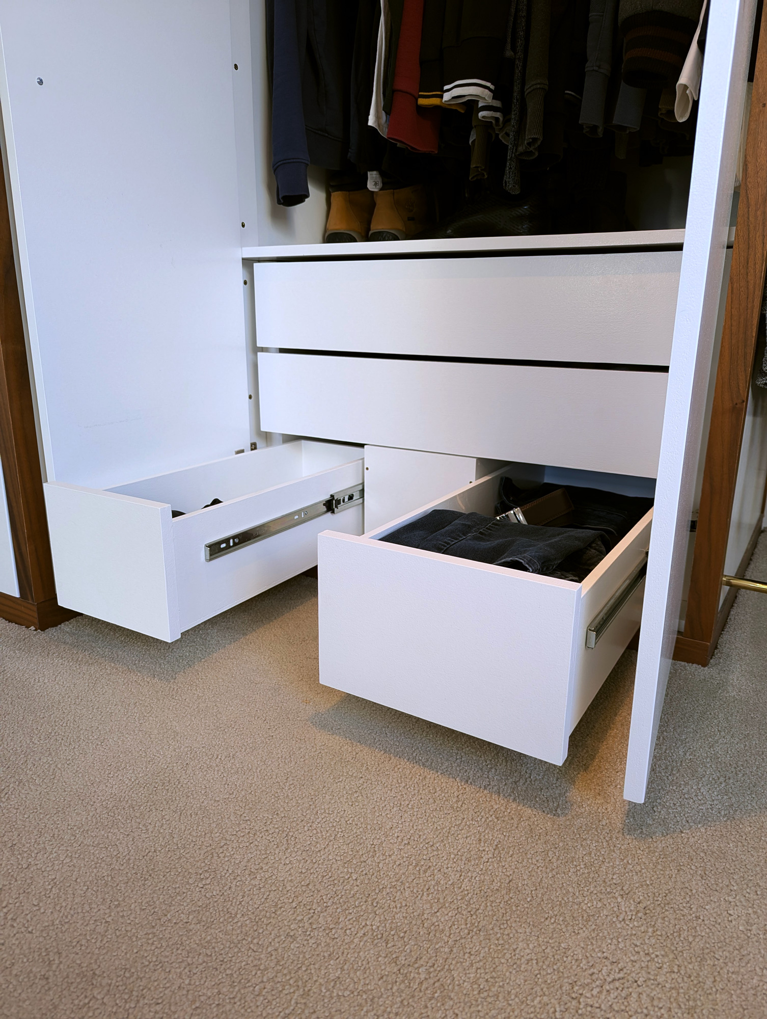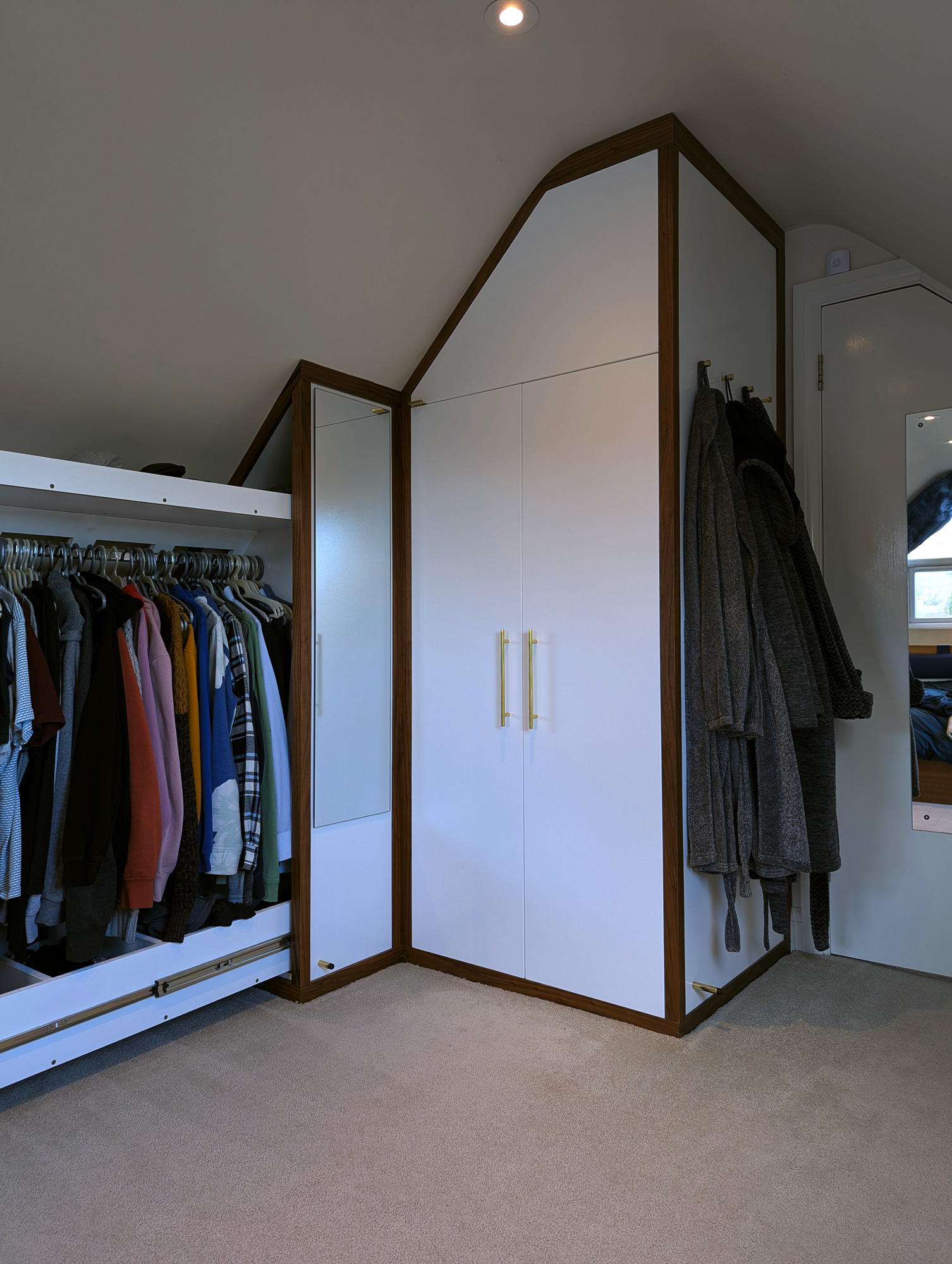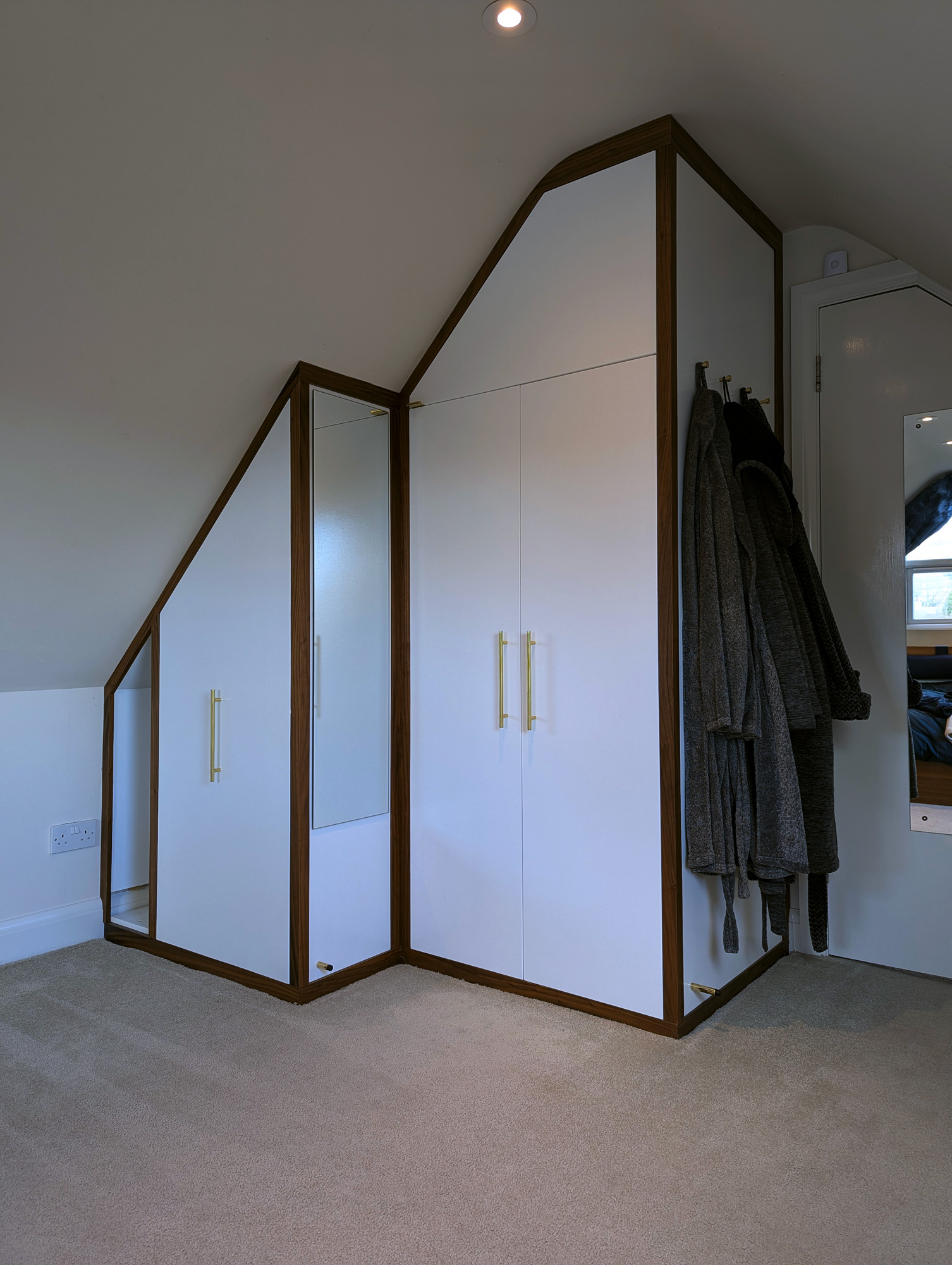 I designed & built this compact double wardrobe for my bedroom in my chalet bungalow's loft conversion. It has two wardrobe compartments (one slide-out and one standard) and features a number of drawers and storage surfaces for extra items. The drawers at the bottom are specially configured to allow maximum space usage around the soil stack that extends from the adjacent bathroom. The box at the bottom-middle of the drawers also features an access hatch, should the soil pipe need to be reached in case of repairs etc.